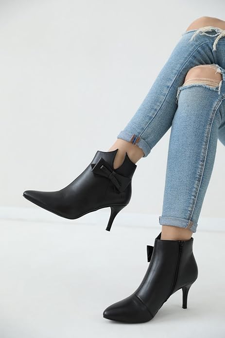 - Ankle Boots; Stiletto Heel; Pointed Toe; Bow Decor
