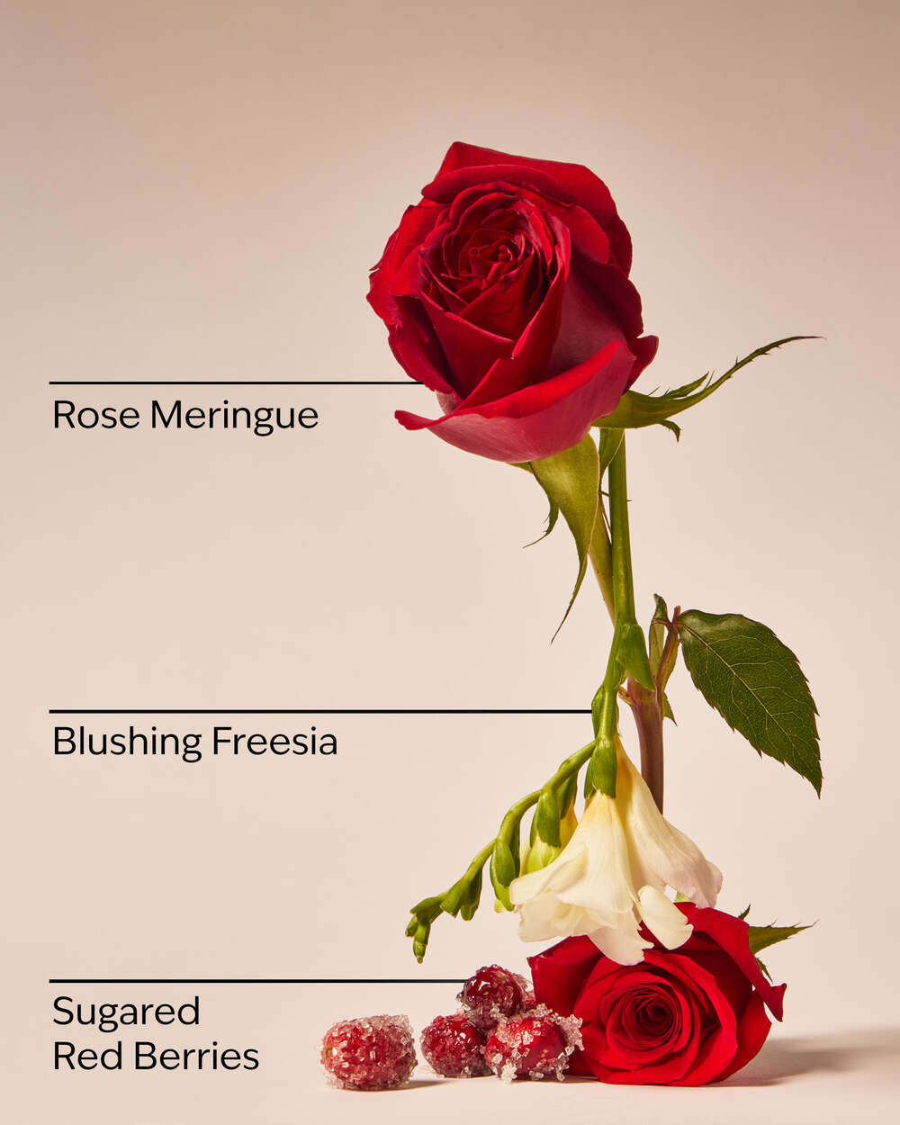 Fragrance notes: sugared red berries, blushing freesia and rose meringue.