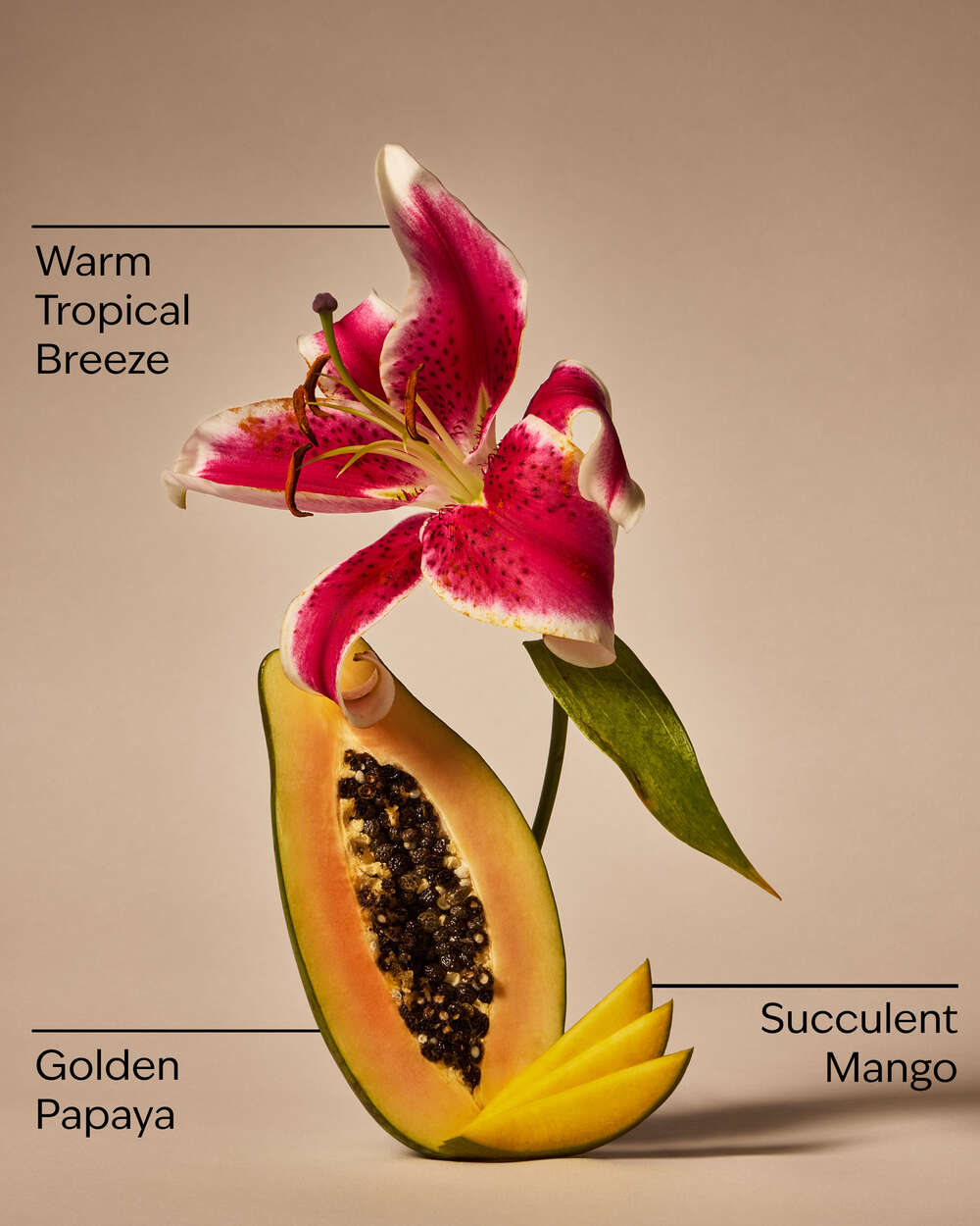 Fragrance notes: succulent mango, golden papaya and warm tropical breeze.