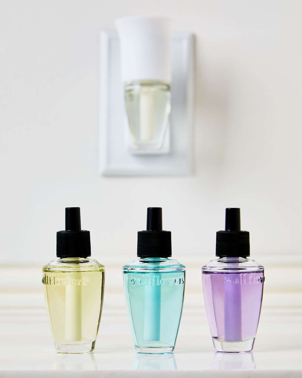 - Because Wallflowers refills contain fragrance oils that may damage finished surfaces and some plastics, always keep a 12″ clearance above your plug to prevent damage to surrounding surfaces.