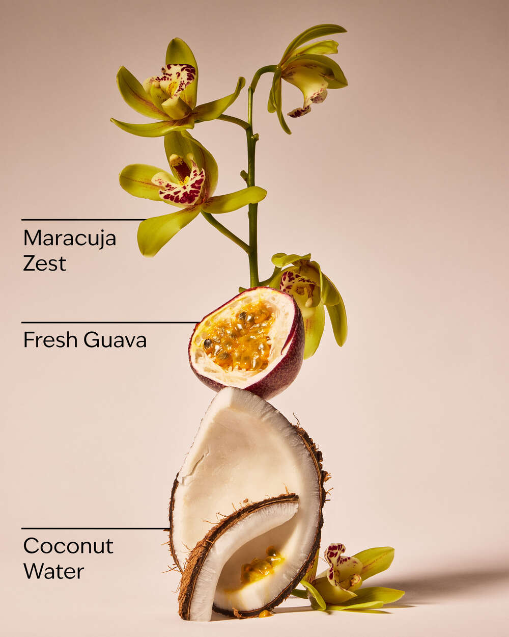 Fragrance notes: fresh guava, maracuja zest and coconut water.