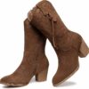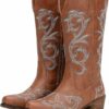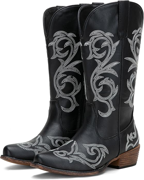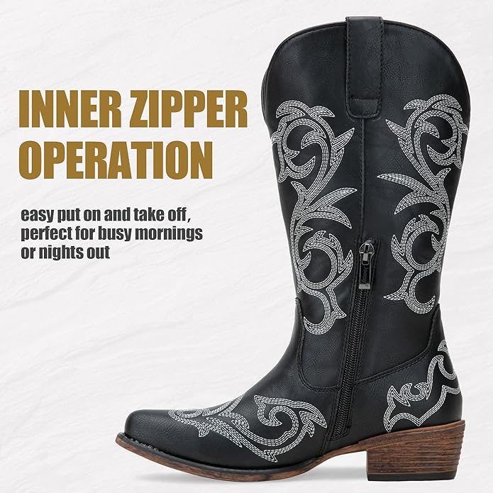 - [VINTAGE BOHO EMBROIDERY] : Tired of plain boots that never get noticed detailed western embroidery and a mid calf height create a modern cowgirl look effortlessly freeing you to pair them flawlessly with skinny jeans or lovely spring casual dresses